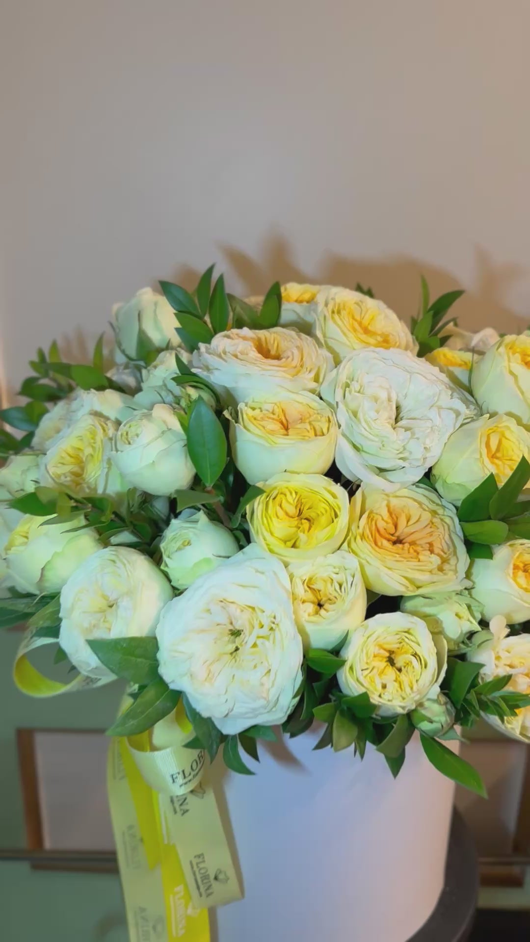 Premium garden roses in soft white and sunny yellow tones open into lush, ruffled petals with a peony-style bloom. Their warm golden centers create a radiant, natural glow, making this design feel both fresh and luxurious.